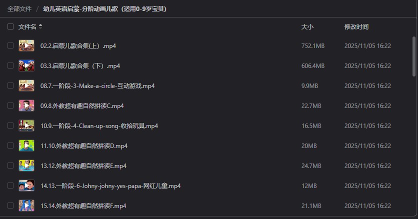 - 《幼儿英语启蒙-分阶动画儿歌(适用0-9岁宝贝)》【 39集全 / 2.9G 】
