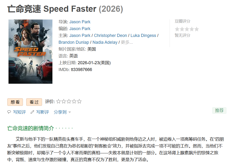 - ❤️【最新上线犯罪动作片】亡命竞速 Speed Faster【2026】BD1080P [中文字幕] [6.2G]