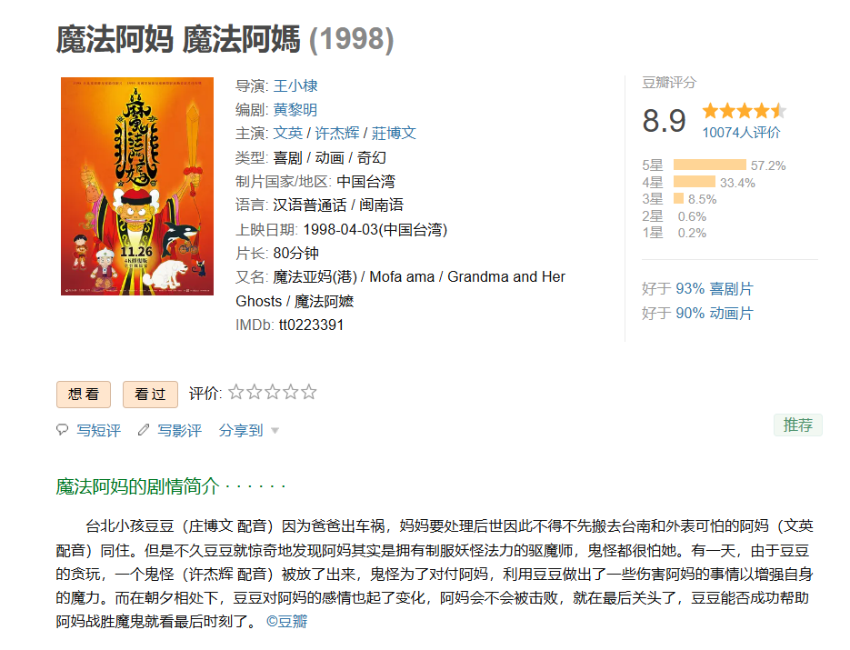 ❤️【豆瓣8.9分的台湾“鬼节”必播奇幻动画】魔法阿妈【1998】BD1080P [中文字幕] [3.2G]